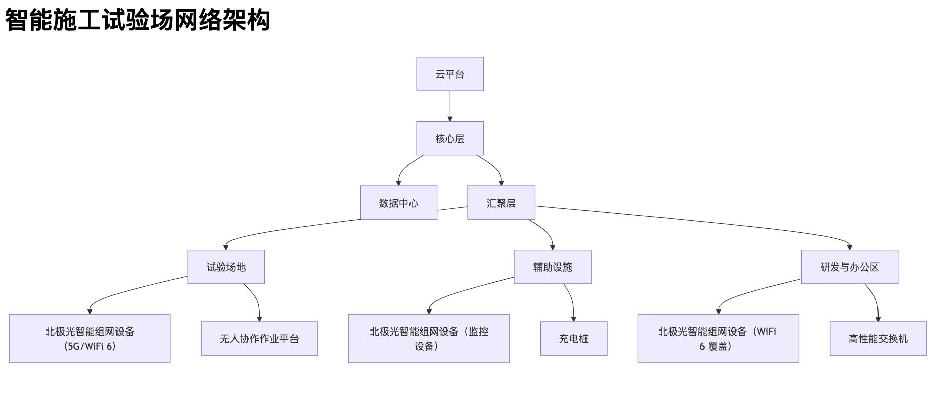 本方案通过采用分层网络架构和智能组网设备,构建了一个高效、安全、灵活的大型智能施工试验场网络。该方案不仅满足当前智能设备测试需求,还为未来扩展提供了技术保障。